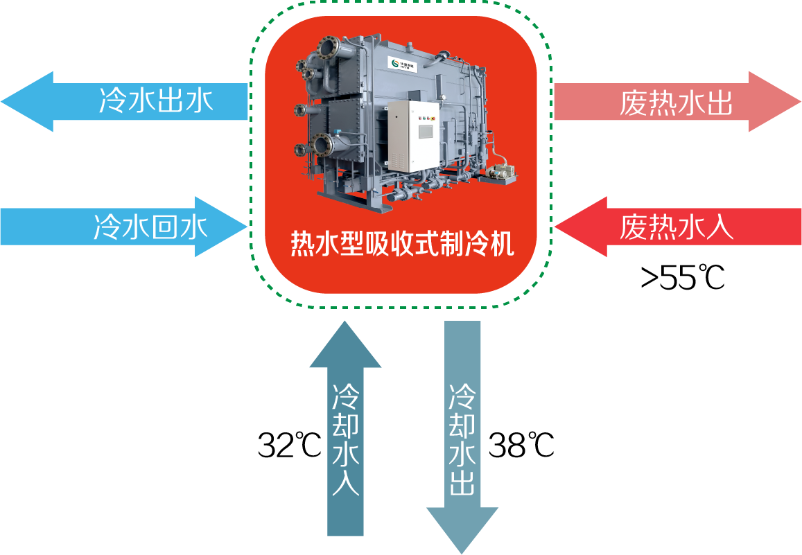 工业生产过程中,会产生大量的余热与化学反应热,这部分热量排放到周围的环境中,不仅造成大量能源的浪费,同时会对周边环境造成严重的热污染。而吸收式制冷技术可以充分利用排放的余热与化学反应热,制取冷水满足工艺本身的用冷需求。有效提高系统能源的综合利用率,降低生产成本,提高企业竞争力,达到节能、节水、减排的效果。