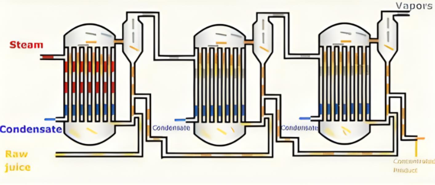 多效蒸发(MEE):通过多个蒸发器依次进行蒸发,前一效的蒸汽冷凝水作为下一效的热源,实现热能的逐级利用。每一效都有自己的蒸发器和加热器