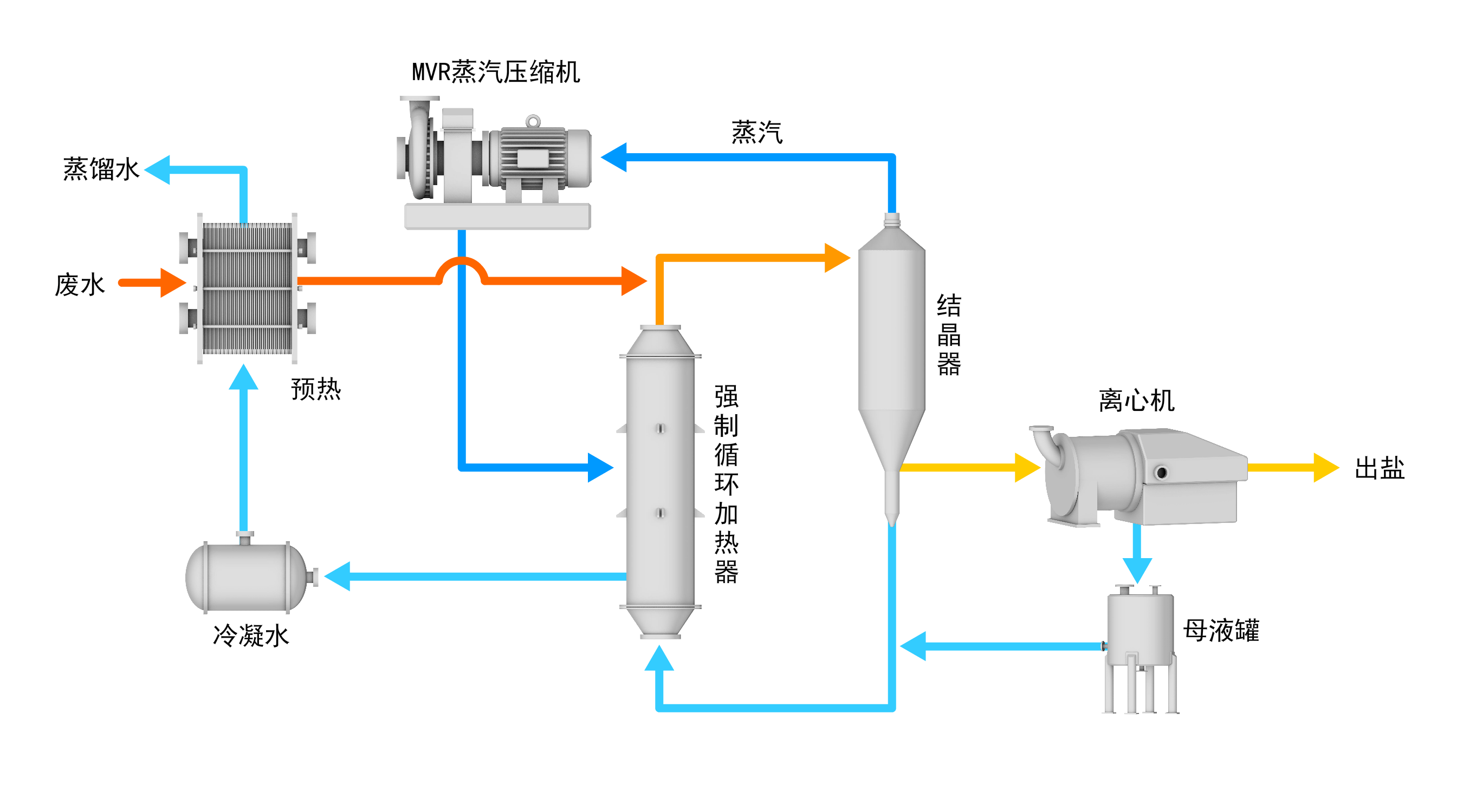 1、MVR蒸发结晶技术可以将废水中各种盐类结晶分离出来,获得品质优良的蒸馏水;